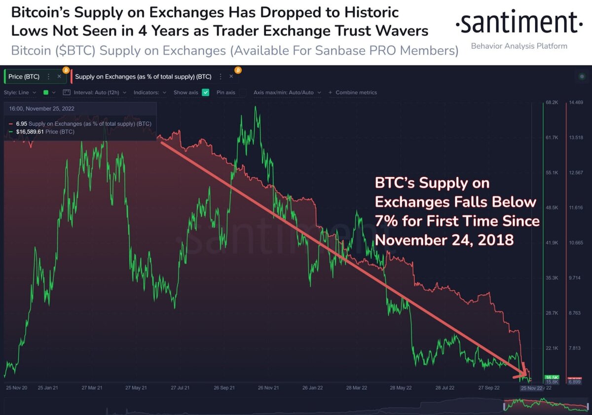 santiment данные. Постепенное перемещение $BTC под собственное хранение началось еще в #BlackThursday (Mar 2020). Но после падения #FTX эта тенденция ускорилась.