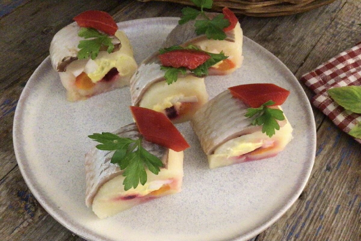 Здравствуйте, дорогие подписчики и гости моего канала. Не за горами новогодние праздники. И мысли о блюдах для праздничного стола посещают многих хозяек. Сегодня хочу поделиться с вами рецептами приготовления рыбных закусок. Роллы с селёдкой вместо привычного салата “ под шубой”. Ингредиенты: • Селёдка-2 шт • Свёкла- 2 шт • Картофель-400 г • Морковь-200 г • Перец сладкий-1 шт • Яйца-2 шт • Майонез-3 ст л Приготовим. Все необходимые овощи хорошо надо помыть и поставить варить. Картофель почистить, нарезать на кусочки и варим отдельно. Затем варёные яйца, свёклу и морковь нарезам крупной соломкой. Яичный желток смешиваем с майонезом Селёдку разделываем на филе и нарезаем на кусочки. Затем берём бамбуковый коврик, застилаем пищевой плёнкой. Раскладываем на коврик картофельное пюре. После чего, на картофель с одного края по всей длине раскладываем овощи. Сверху раскладываем яичную массу. Далее при помощи коврика и пищевой плёнки, сворачиваем в плотный рулет. Рулет из плёнки не разво