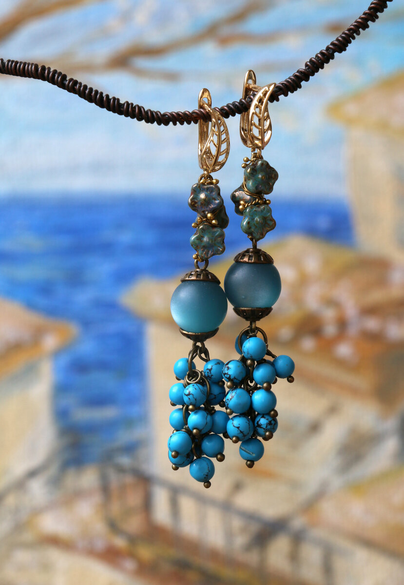 Длинные серьги в оттенках голубого в винтажном стиле. Использованы чешские стеклянные цветочки, старые матовые голубые бусины (80е гг) и винтажные пластиковые бусины под бирюзу (70е гг). Закреплены на листиках-швензах с английским замком из позолоченной латуни.