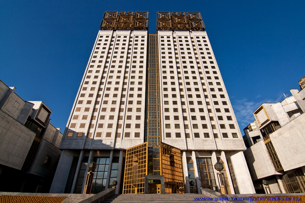 Особняком в этом списке стоит здание Президиума РАН. Это белое здание, состоящее из двух высоток с непонятными золотистыми конструкциями на крыше, расположилось на Ленинском проспекте, 32а, у подножья Воробьевых гор. И хотя его строительство затянулось до 1990-ых, спроектировано оно значительно раньше.