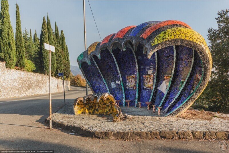 В отличии от первого дня, где много времени ушло на дорогу к оз. Рица, второй день стал насыщен разными экскурсионными объектами. Мы успели посетить три города, благодаря близкому расстоянию друг от друга. Наш экскурсовод Тоня продолжила рассказ о родной Абхазии, и время в пути проходило незаметно. Интересно, что все автобусные остановки- павильоны, которые мы видели на маршруте Гагра- Пицунда- Новый Афон, украшены мозаикой. Каждая из них - отдельный сюжет, произведение искусства, и советское наследие). Автор - знаменитый художник и скульптор - Зураб Церетели. Павильоны- это дипломная работа автора. Волна, Ракушка, Петушок, Космическая тарелка, Дельфин... Печально, что павильоны не реставрируют, и памятники архитектуры понемногу разрушаются. По пути в Пицунду наша группа сделала остановку у одного из символов города Гагры - ресторана "Гагрипш". Деревянное здание с часами было привезено из Скандинавии в 1902 г. и собрано на месте без единого металлического крепежа. Механические часы