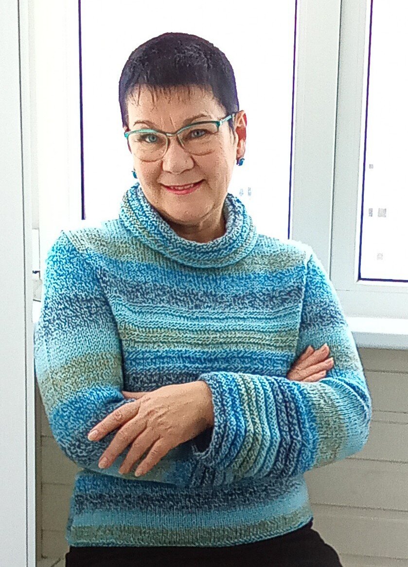 У меня много разных мной связанных свитеров и других фасонов плечевых изделий. А вот про этот свитер я совсем забыла. Выполнен свитер из секционной пряжи. Производителя не смогу сказать. Свитер связан давно и я раньше не обращала внимания на артикулы и составы пряжи. На сегодняшний день почти все производители пряжи выпускают пряжу секционного окрашивания и разных составов. Выбрать можно. Иногда меня например останавливает купить такой вид пряжи. Не всегда представляю сразу как воплотить в интересное изделие. Но можно создать уникальную модель. Предлагаю рассмотреть простую модель свитера и в то же время с небольшой изюминкой. Акцент в этом изделии на рукавах и воротнике. Чтоб связать такой свитер достаточно уметь вязать только лицевые и изнаночные петли. Основная вязка свитера это лицевая гладь. Гофрированные рукава и воротник выполнены из трёх рядов лицевой глади и из трёх рядов изнаночных петель. И в области груди я так же выполнила такие дорожки. Свитер слегка приталенный, св