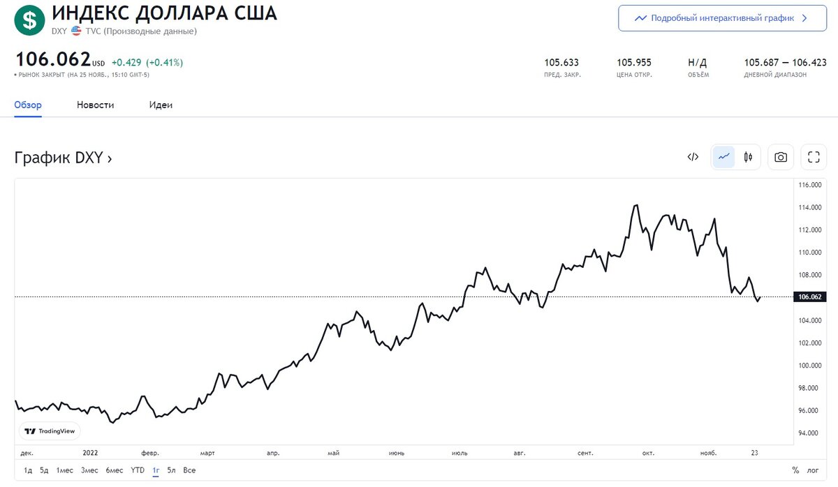 Мировой курс доллара, похоже, наконец, начал нисходящий тренд. Во всяком случае, очень заметно отошел от достигнутых максимумов, такой сильной коррекции за последний год еще не наблюдалось. После отметок выше 114, почти 115, индекс доллара опустился до уровня 106. При этом на графике, с точки зрения технического анализа, сформировалась разворотная фигура "тройная вершина". Фигура уже свое отработала, и куда индекс пойдет дальше - неизвестно. Но то, что он вернется к максимумам и обновит их, сейчас мне видится маловероятным. Индекс доллара - это показатель, характеризующий отношение доллара к корзине из 6 других ведущих мировых валют, большую долю в корзине занимает евро. Подробно описывал суть и структуру этого показателя в отдельной статье: Индекс начал восходящий тренд с мая 2021 года, и продолжался он до 10 октября 2022 года (в том случае, если рост не возобновится). То есть, снижение началось после оглашения результатов предпоследнего заседания ФРС по учетной ставке (12 октября),