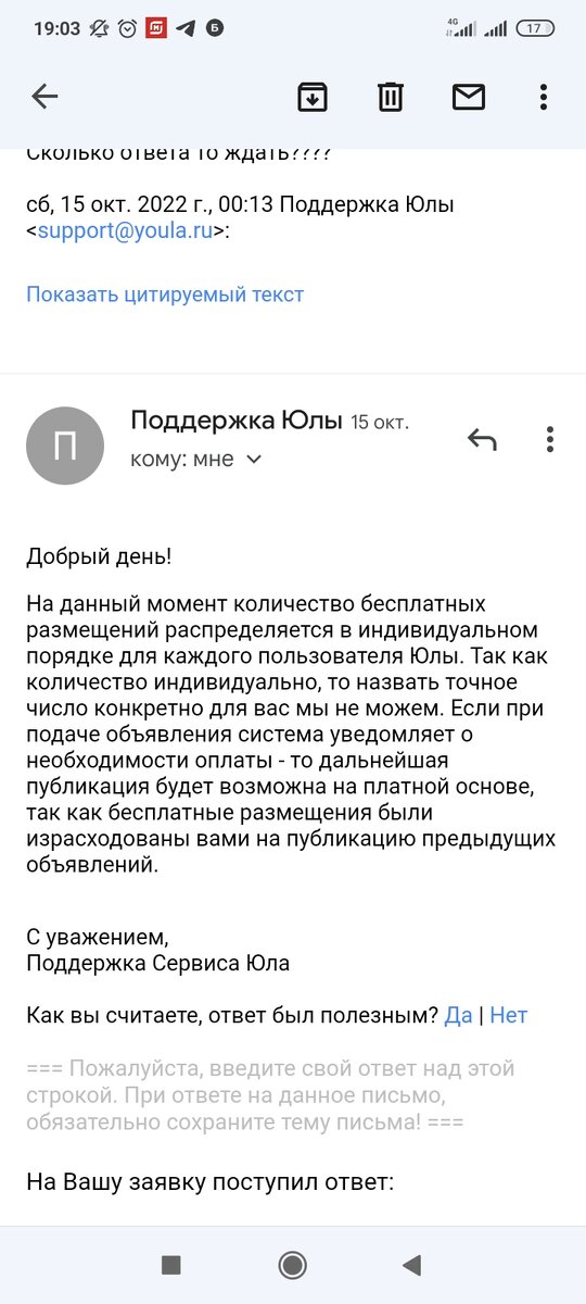 Вчера в комментариях увидела ответ по поводу лимитов на Юле, и написание статьи напросилось само. В сентябре я столкнулась с очень неприятной для меня ситуацией. В один из прекрасных дней я не смогла бесплатно разместить объявления о продаже вещей на площадке Юла. И в какой бы категории не пробовала, мне предлагалось разместить только на платной основе. Через пару дней безуспешных попыток, я обратилась в службу поддержки, на что получила ответ А суть вся в том, что когда я размещала объявления в категории "красота и здоровье", у меня закончился лимит, и я оплатила размещение одного объявления.🤦♀️ С Авито таких проблем не возникало. Служба же поддержки, писала одно и то же ☝. Подождав месяц ничего не изменилось. Хоть бесплатно ты отдай товар, вынь на полож им 11 рублей за размещение. Так что дорогие читатели, будьте внимательны при размещении объявлений и не допускайте моих ошибок. #авито#юла#лимиты#