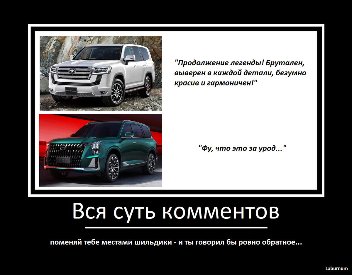 Сегодня хочу поговорить о том, как навязанные обществом и маркетингом штампы о "плохом" и "хорошем" заменяют здравый смысл и объективный взгляд на вещи. Искал давеча кое-какую инфу на внедорожных форумах и случайно наткнулся на профильном ресурсе по Land Cruiser на обсуждение только что вышедшего (на тот момент) нового "Крузака". Мнения, как водится, были разные, но в целом машину восприняли положительно. Оно и неудивительно, собственно. Ведь это "легенда"! Пусть и "скатившаяся к кроссоверам". И разумеется, "последним настоящим" было предыдущее поколение. Ну как всегда. Но зацепило другое. Один из участников конференции поимел неосторожность сравнить дизайн нового внедорожника с... китайским аналогом. Что тут началось... Разумеется, автор сей ереси был мгновенно облит всеми возможными субстанциями. Да и правда - как он, вообще, посмел! Сравнить какое-то нелепое китайское поделие из подвала с самим великим "Ленд Круизером"! Дизайн которого, как известно, рисуется исконно-японской знатью