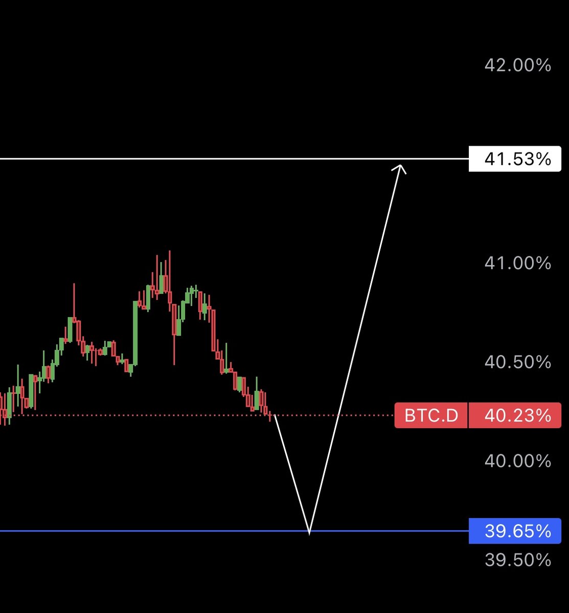 Часть из них показали положительную динамику, но за доминацией редко следят и ставят в объектив действий - торговав те же альткоины , так как дивергенции могут указывать одно, а стоимость актива может и не придти к уровням которые вы ждёте. Поэтому делаю акцент на то что при торговле смотреть, что происходит в частности с доминацией $BTC - важный атрибут. Ожидаю ослабление до уровня 39.65% и подъем до верхней границы блока.