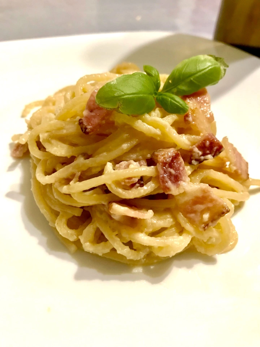 Блюдо итальянской кухни, было изобретено в середине XX века. Паста карбонара является традиционной для итальянского региона Лацио, центром которого является Рим. Готовится эта паста очень быстро, но это никак не сказывается на её вкусовых качествах - это одна из самых любимых и популярных паст. Для рецепта нам понадобится: Спагетти - 450г (1 пачка) Бекон -400г Сыр твёрдых сортов, лучше пармезан - 200г Яйца куриные - 2шт. Желтки яичные - 3шт. Соль, чёрный перец Ставим воду для спагетти кипятиться (примерно 4л и 1ст. ложку соли). Пока вода закипает на глубокой сковородке разогреваем немного масла и выкладываем туда порезанный на полоски шириной 1см бекон. Бекон обжариваем до золотистости. Пока жарится бекон разбиваем в миску 2 яйца, а также добавляем желтки ещё 3-х яиц, солим, перчим и взбиваем вилкой. Затем в яйца добавляем тёртый на мелкой тёрке сыр и тщательно перемешиваем. К этому времени, скорее всего вода уже скорее сего закипела - ставим вариться спагетти. Я обычно не смотрю на в