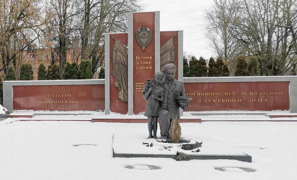 В Смоленске, на центральном проспекте, носящем имя Ю. Гагарина, можно увидеть невероятно трогательную скульптурную группу - фигура маленькой девочки, прильнувшей к плечу отца - сотрудника полиции, преклонившего колено и склонившего голову, почтившего память погибших товарищей. Это - часть мемориала "Солдатам правопорядка, погибшим при исполнении служебного долга", открытого возле здания Культурного центра УМВД 6 ноября 2014 года. Здание по адресу Гагарина,15 известно многим смолянам, - помимо Культурного центра, называвшегося в былые времена просто клубом милиции, здесь находится отделение полиции УМВД и Заднепровский районный суд. А в 1941 году здесь располагалась школа милиции, курсанты которой приняли неравный бой с немецко-фашистскими захватчиками, героически обороняя Смоленск. На этом месте советский милиционер Григорий Иванович Поддубный бросился под фашистский танк, обвязав себя гранатами, - подвиг такого рода был в истории первым. В бою погибли почти все защитники этого уг