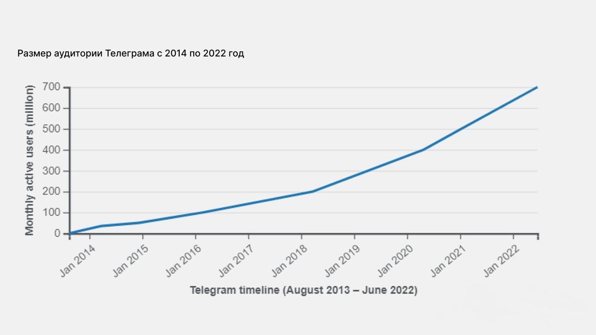 В июне 2022 года число пользователей Telegram достигло 700 миллионов человек. 50 миллионов из них — российские пользователи.