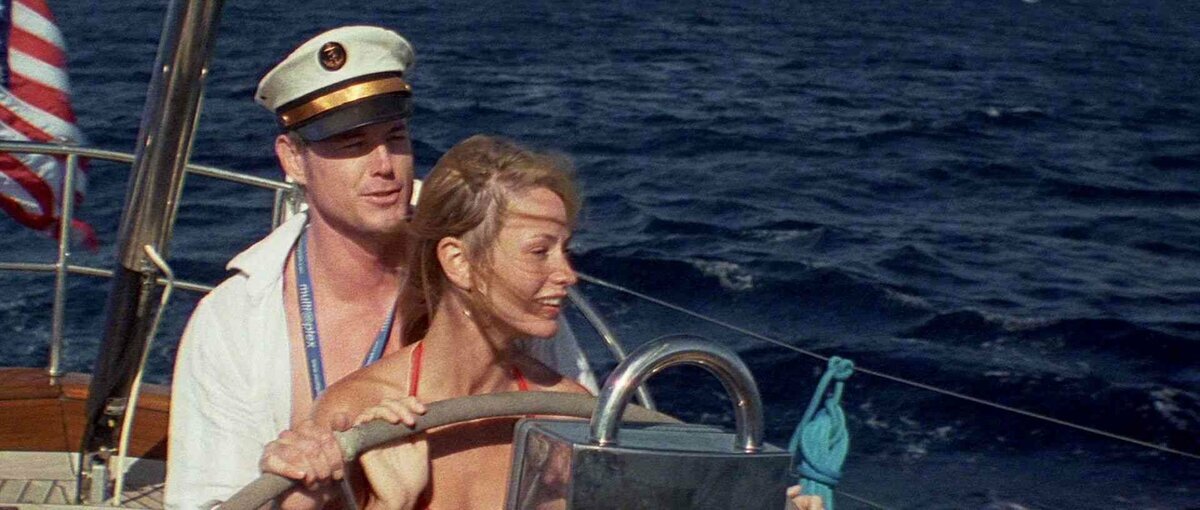 Ветер выключили, волну и не включали ни разу, парус убран. Понятное дело, что в съемочном павильоне волны нет. Все прыгают купаться. Капитан, как и положено остается на борту, но капитанка заменяет ему мозги и он, поймав в объятия даму в спасжилете, прыгает с ней за борт. Совершенно забыв опустить купальную лестницу или, как оказалось в конце, целую купальную платформу. Кстати, нам объясняют, что ее спасжилет это последствия детской психотравмы