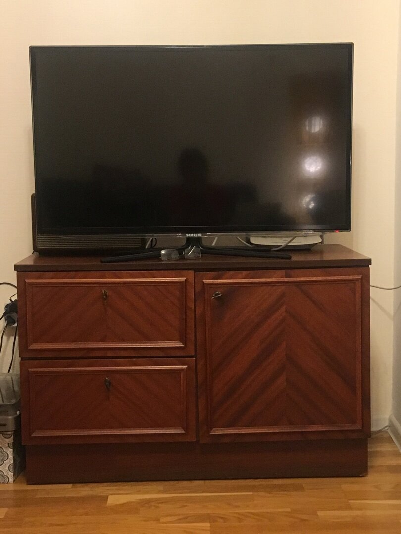 Я отправилась на Авито и там нашла эту польскую тумбу, натуральный шпон, цена 3000. Ещё на 3000 мы купили краску, ножки и ручки. И за 6000 получили уникальный экземпляр
