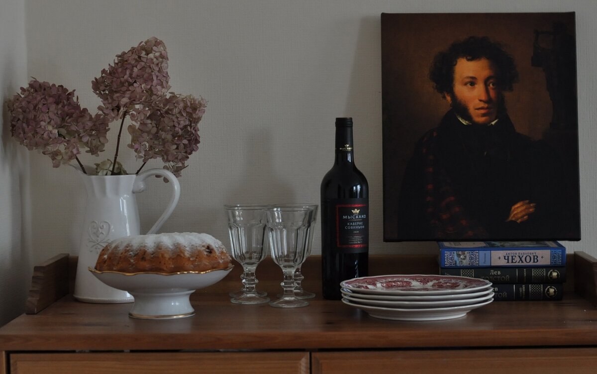 Вот у меня тут такая виньетка образовалась и отражает она следующее: в моем саду растут гортензии, мне нравится Дулевский фарфор и винтажная посуда, я люблю печь кексы, пить красное сухое и читать классику