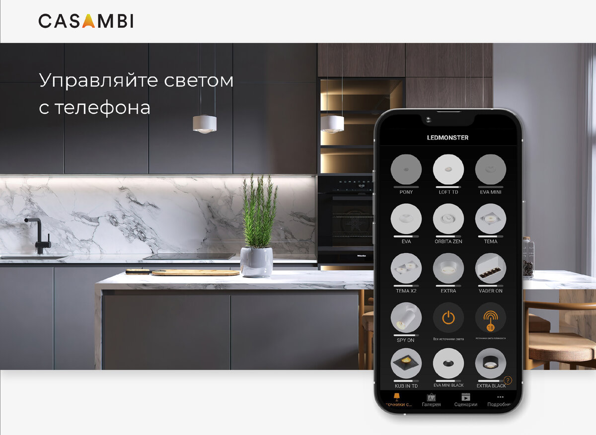 Гаджеты в наших руках — это не только средство общения и связи с миром, но еще и возможность использовать их как пульт управления. В этой статье рассказываем про удобную и недорогую систему управления светом Casambi и как ее интегрировать в светильники от Ledmonster Система Casambi В 2011 году несколько человек из отдела разработки NOKIA запустили новый проект — цифровую систему управления, которая позволяет удаленно управлять светильниками по Bluetooth. Casambi — это сигнал с низким уровнем потребления электроэнергии на гаджетах, который был специально создан для постоянной связи периферийных устройств. В каждом устройстве Casambi есть специальный чип Bluetooth Low Energy, который подключается к светильнику или группе светильников дистанционно. В одну такую сеть можно объединить до 127 устройств и управлять ей можно с телефона, планшета, смарт-часов, датчиков, а также с помощью фирменного или обычного настенного выключателя. К системе можно подключить светильники 220V, низко