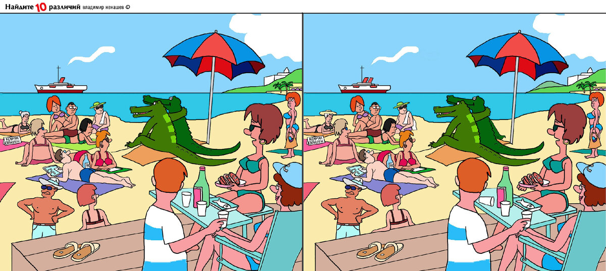 Друзья, отправляемся загарать и отдыхать на море! Веселый рисунок на пляже. Выбирайте удобный формат для просмотра) Удачи! ответ - подсказка Рисунки с различием от автора)) Не скопированы из зарубежных сайтов и журналов, а нарисованы автором совсем недавно! Свежее)! Автор старается учитывать пожелания читателей по рисункам) Рисунки для внимания и отдыха. Позитивный отдых. Сделано в России. Позитив / Владимир Ненашев