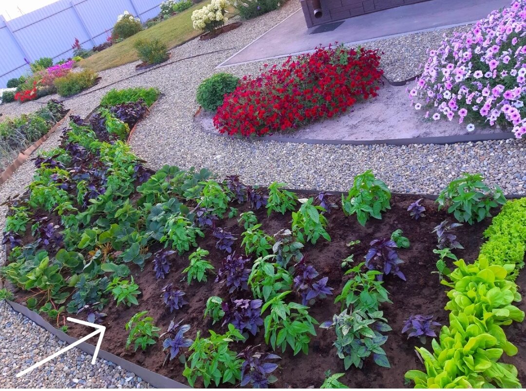 Этот вопрос мне в комментариях задают частенько😊 Не только цветы у меня на территории. Хотя в кадр попадают именно они - ведь канал посвящен в большей мере цветам и цветущим. А огород - не в центре объектива. Он существует для вкусной еды, которую я люблю. Сажаю не в космических масштабах - нет такой цели. А для удовольствия. Хотя в голом песке вырастить огород - это квест не для слабонервных. Я большой любитель зелени - поэтому грядки с базиликом, петрушкой, луком, укропом, салатами - это обязательно. Нравится мне художественный огород - вот и сорта базилика по цвету рассадила для красивой картинки: И чеснок урожаем не подводит - вот на фото одна долька. Люблю клубнику - просто не представляю лето без этой ягоды. Тоже выращиваю: Растет у нас и картошка - в голой песчаной земле - тоже часть квеста ее сажать и поддерживать в росте. Небольшая теплица - домик для помидоров. Радует возможность сорвать ароматный помидорчик для салатика. Свои свежие помидоры доедаем к концу декабря. Так