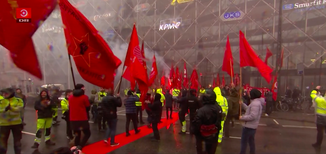 В Дании есть такой анекдот: Однажды датчане решили сделать в стране революцию, и направились на главную площадь страны. Но вдруг пошел дождь, и датчанам пришлось вернутся домой, ведь они забыли взять зонтики. Так Дания избежала революции. Сегодня в Копенгагене лил дождь, однако на этот раз датчане взяли с собой на площадь не только зонты, но и красные знамёна! Впечатляющее зрелище! Заметьте, знаменосцы даже красную дорожку через дорогу постелили! Что происходит? Неужели в маленькой Дании намечается революция? По сути, это так. Дело в том, что сегодня начались переговоры между работодателями и рабочими, занятыми в сфере строительства. То есть капиталисты проклятые вынуждены сесть за стол переговоров с самым что ни на есть пролетариатом - людьми, которые выполняют тяжелую и низкооплачиваемую работу в индустрии. Такие переговоры происходят обычно раз в два-три года. Во время переговоров устанавливается минимальная зарплата для трудящихся и условия труда - сколько часов в день мо