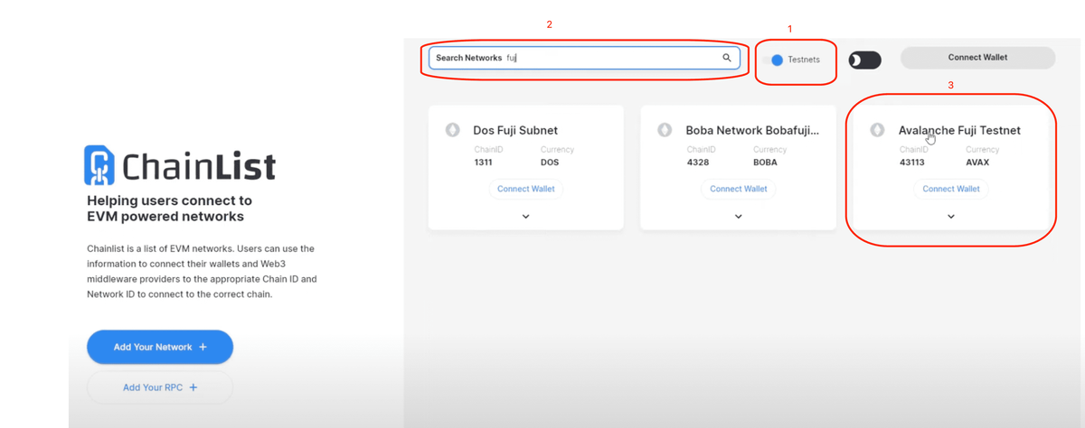Перейдите по этой ссылке. Передвиньте бегунок в положение “TestNets”, затем введите в поиске “Fuji” и присоедините кошелек “Avalance fuji Testnet”.