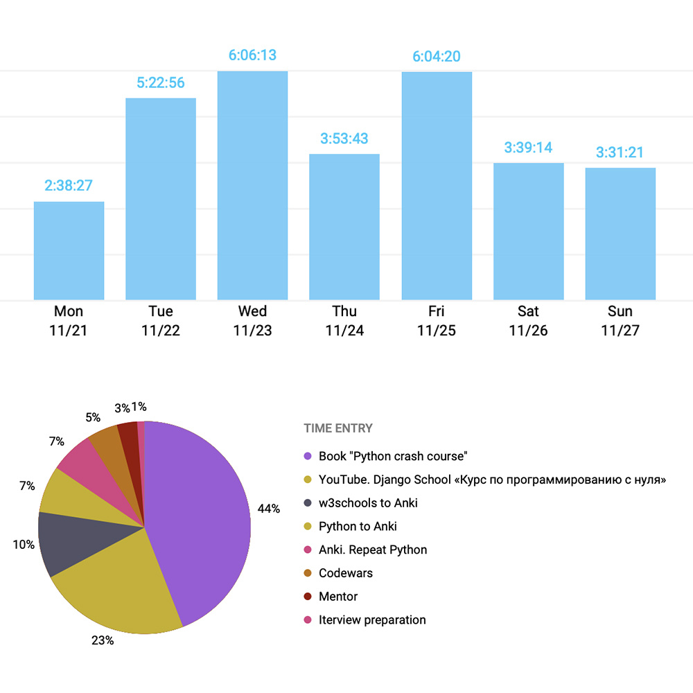 – Попробовал заучивать функции и методы с помощью Anki, разочарован. Потратил много времени (25%) на создание карточек и угадывание ответов. Понимаю, что удели я это время решению задач на codewars, эффективность недели была бы