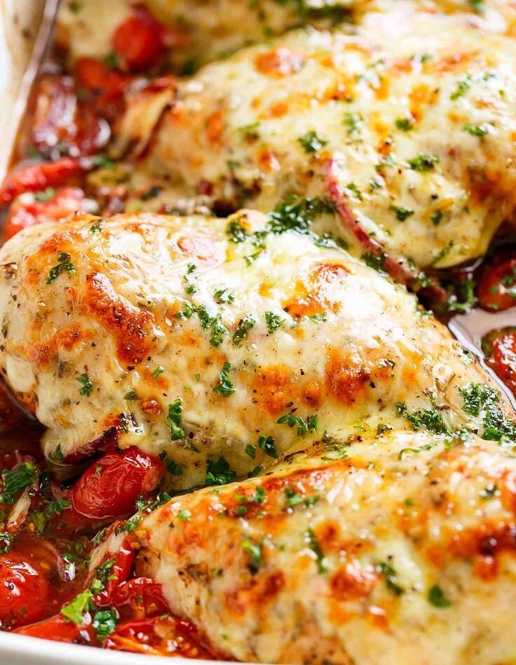 Ингредиенты: 3 куриных филе, 150 г моцареллы для пиццы, 1 помидор, 100-150 г шпината, 2 ч.л. специй для курицы, щепотка молотого перца, соль, оливковое масло Куриное филе промыть, просушить, разрезать вдоль не до конца, чтобы получился "кармашек". Посолить, поперчить и приправить специями. Моцареллу натереть на крупной терке. Шпинат промыть и просушить. Помидор нарезать на тонкие ломтики. Форму для запекания сбрызнуть маслом. Выкладываем несколько листиков шпината, затем кусочки филе, начиняем их шпинатом, сыром и помидором. Запекаем в духовке 25 минут, пока не подрумянится сверху. За 5 минут до готовности сверху еще немного сыром присыпать