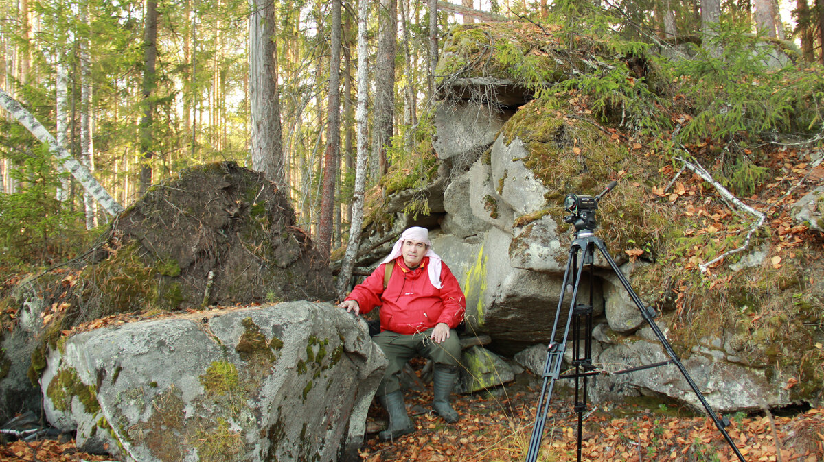 Снимать в лесу себя задача непростая. Съёмка начинается с объяснения, что собственно хочет показать автор своему зрителю. Несколько фраз чтобы сохранить динамику. Автор уходит вперёд по тропе - камера снимает его уходящим. Автор, мысленно отсчитывая секунды, останавливается и быстро бежит к в/камере, если она не оснащена ДУ чтобы успеть выключить. И так далее, съёмка проходящих ног слева направо. В полный рост, чтобы показать куст рябины с сочными красными кистями, или довольно-таки симпатичный камень или корягу. На все эти хождения уходит время, автор устал и в поту. Пора присесть, умыться и перекусить.