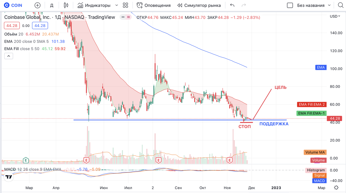 Купить на поддержке в районе 40$, поставить стоп на 39,9$, продавать у сопротивлений по 60$ и 80$.