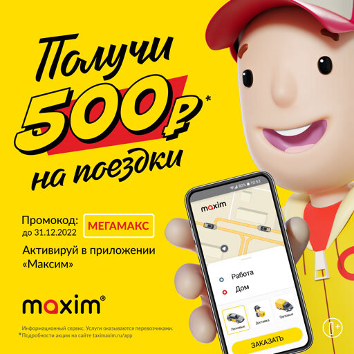Еще в приложении «Максим» низкие цены на поездки, а по промокоду МЕГАМАКС заказы будут еще дешевле. Активируйте промокод, и на счет придет *500 премиальных рублей. Ими можно оплатить до 10 % стоимости заказа.