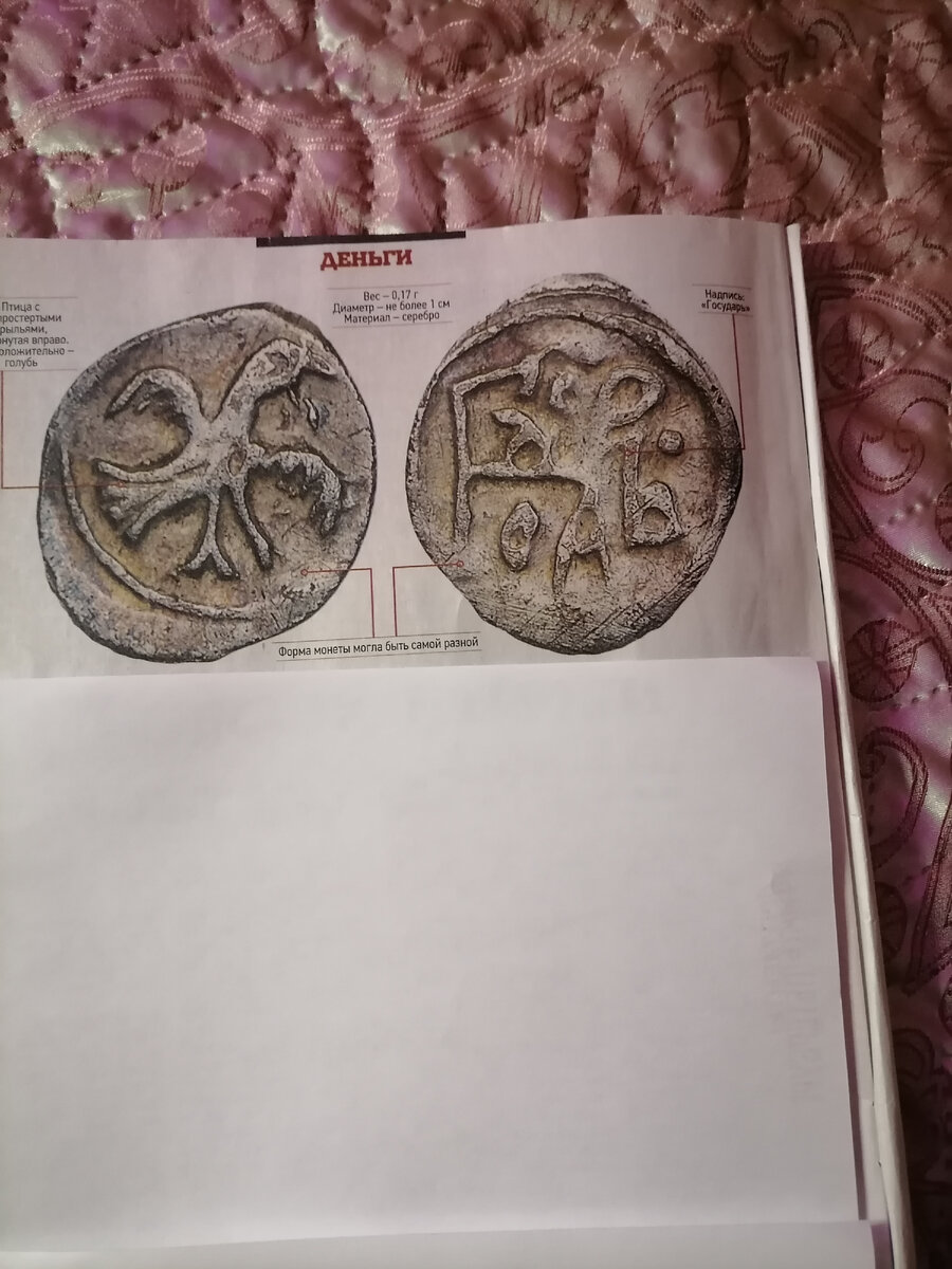 ЦАРСКИЕ ПТИЧКИ Само название монеты - полушка - говорит о том, она является половинкой чего-то. И в самом деле полушка весила в половину меньше деньги, поэтому её иначе и называли "полуденьгой". Правда существует версия, согласно которой "полушка" происходит от слова "пол-уха". Когда - то существовали меховые расчётные единицы. Целой единицей была шкурка зверя ( белки, соболя, или куницы). У разрезаной пополам шкурки оставалось лишь ухо. А четвёртая часть шкурки звалась " пол-ушка". Монеты с названием "полушка" начали чеканиться ещё в годы правления великого князя Василия Дмитриевича, сына Дмитрия Донского. Первые такие монеты представляли собой смесь русской и ордынской символики. На лицевой стороне можно различить портрет правителя, вооружённого саблей, а также остатки великокняжеской легенды (в её состав входило слово "князь"). Оборот заполнен арабской вязью. Впрочем среди полушек князя Василия Дмитриевича встречаются экземпляры, обе стороны которых заполнены подорожание арабской