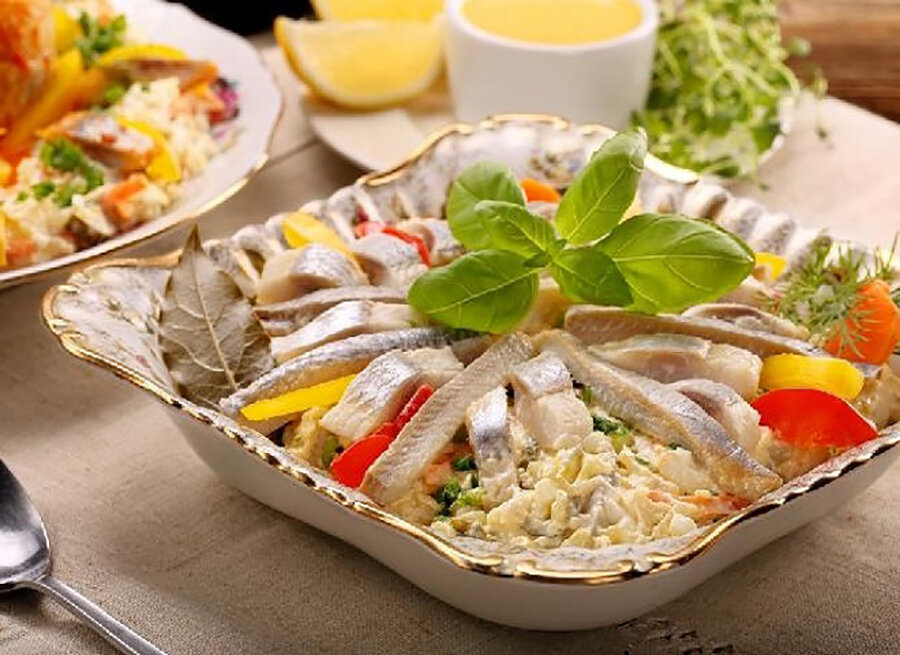 Овощной салат с селедкой - обогащенный вариант традиционного овощного салата. Это любимое польское блюдо, рассчитанное на 6 порций, я готовлю всего за 20 минут! В таком варианте овощной салат с селедкой станет отличным дополнением к праздничной закуске. Также его можно приготовить как салатный вариант постного обеда или как традиционную «селедку». Ингредиенты: Приготовление: Помойте зелень. Сварите (10-15 минут) и очистите морковь и сельдерей, а затем нарежьте кубиками. Яблоко очистите от кожуры и вычистите серединку, нарежьте кубиками. Также нашинкуйте очищенные яйца и маринованные огурцы. Добавьте процеженный горох, осушенную салфетками сельдь, майонез, специи, лимонный сок и все перемешайте. Посыпьте салат нарезанным зеленым луком. Перед подачей на стол поставьте в салат холодильник на 1 час, чтобы аромат стал насыщенным. Приятного аппетита!