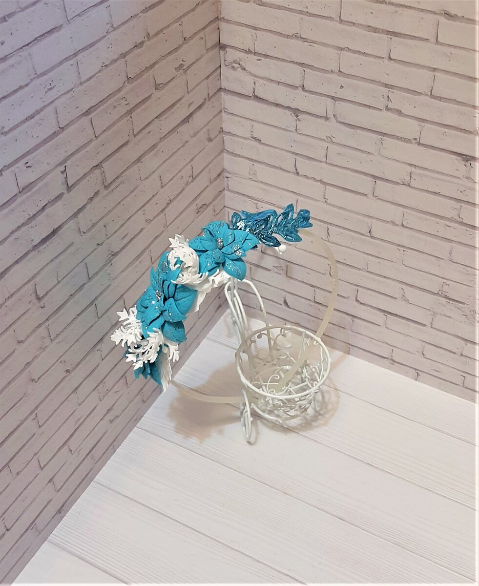 Добро дня! В детстве у меня всегда был самый красивый костюм Снегурочки на новогоднем утреннике! Моя мамочка шила его сама — шубка из накрахмаленной марли, разрисованная красками, с опушкой из ваты, блестящая серебряными завитушками и узорами. Блеск и серебро достигались весьма опасным способом — крошились мелко осколки елочных игрушек и всё это сверкающее великолепие крепилось на клей, создавая настоящий сказочный наряд! У сегодняшних рукодельниц, конечно же, больший выбор материалов и возможностей для воплощения своих творческих идей. И придать блеск изделиям можно гораздо более безопасными методами))). Что-то создается из уже сверкающих тканей, где-то в ход пойдет глиттерный фоамиран, а еще всем в помощь декоративные блестки. Предлагаю подарить вашим Снежинкам и Снегурочкам нехитрый, но нежный аксессуар — ободочек с зимними цветами. Понадобилось: пластмассовая основа (ободок), фоамиран белый, голубой и голубой глиттерный, ножи для вырубки, декоративные тычинки, горячий клей, акрилов