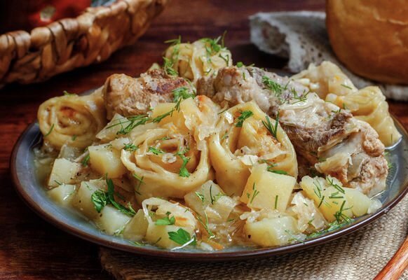 Штрудли (нудли) со свиными рёбрышками, квашеной капустой и картофелем
