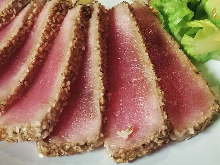 Вы с легкостью приготовите это вкусное блюдо. Свежие стейки тунца покрываются семенами кунжута и быстро обжариваются. Обязательно используйте свежий тунец хорошего качества!