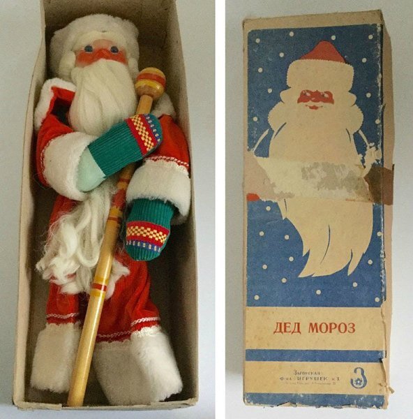 В СССР производилось много елочных игрушек и украшений, высокого качества, детальной отделки. Такие игрушки и украшения любят собирать коллекционеры. И действительно, игрушки раннего СССР были просто изумительны - и ватные, и стеклярусные, и картонные, и дутые стеклянные, и ведь расписаны все вручную! А уж какие качественные были Деды Морозы и Снегурочки! Вот посмотрите, например, какой шикарный Дед Мороз Или вот, например, ручная роспись и сколько подарков, и выражение лица - живое. Конечно, в 80-х годах жизнь начала ускоряться, линии - упрощаться, затраты на производство - уменьшаться. Мне, как ребенку 90-х, уже запомнились только четыре разновидности Дедов Морозов, которые, впрочем, не были редкостью, были почти в каждом доме. Самая распространеная - это пластиковая пара Дед Мороз+Снегурочка (Снегурочек покажу позже). Такая пара была почти в каждом официальном учреждении - в детских садах, поликлиниках и прочих. Знаю, что выпускались они на фабрике "Новинка", там производилось мног