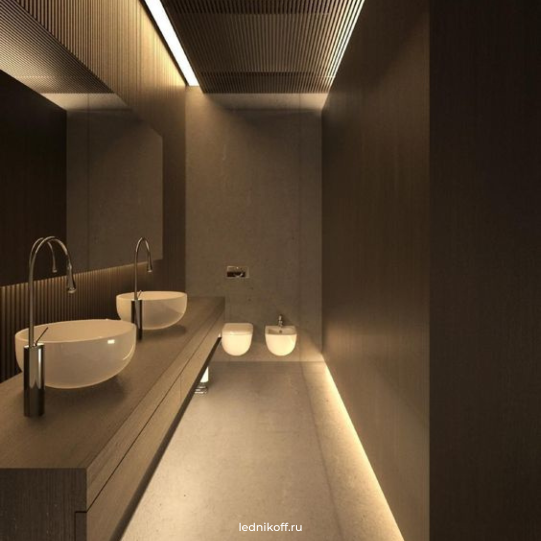 В данной публикации мы собрали для вас разные варианты организации освещения с помощью светодиодной ленты: 1. Подсветка пола в ванной комнате
