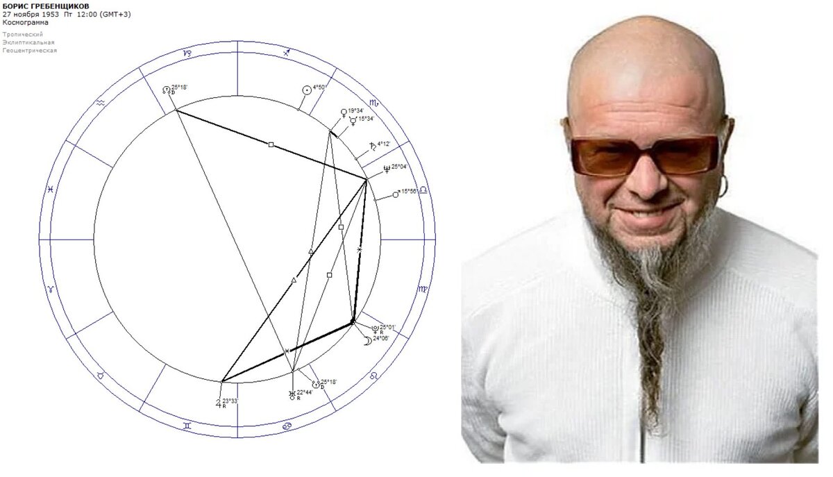 В 1953 году 27 ноября в славном городе-герое Ленинграде родился Борис Гребенщиков, бессменный руководитель музыкального направления олицетворяемого группой «Аквариум». Время его рождения неизвестно, поэтому мы будем рассматривать его характер и склонности в творчестве через призму космограммы…