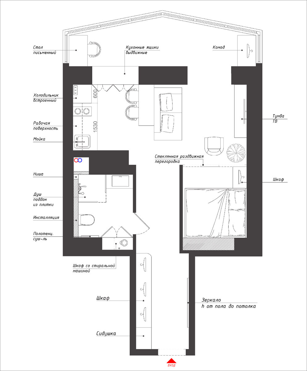 В прошлом году ко мне обратился заказчик со словами: « У меня маленькая квартира с неудобной планировкой, я не знаю что из нее можно сделать, наверно я буду ее продавать…» Я слышу такие слова очень часто, когда самостоятельно не удается придумать хорошее решение и люди просто продают такие квартиры, а иногда и дома! Рассмотрим что не так было с данным проектом ) 1. На исходе мы имели однокомнатную квартиру, где была маленькая кухня в 6.9 кв.м. и одна жилая комната в 11.3. кв.м. В таком случае на данной площади у нас поместится только диван и тумба с телевизором. Диван при этом нужно ежедневно складывать и раскладывать для сна, что откровенно говоря неудобно. И это с учетом, что в квартире проживает только один человек, для двоих такой сценарий планировки становится еще более неудобным. Я бы сама не хотела выходя из кухни ложиться сразу в кровать, либо сидеть на балконе. А если ко мне придут гости? Хотя бы один человек. Ни мне, ни гостю не будет комфортно в таком приватном месте к