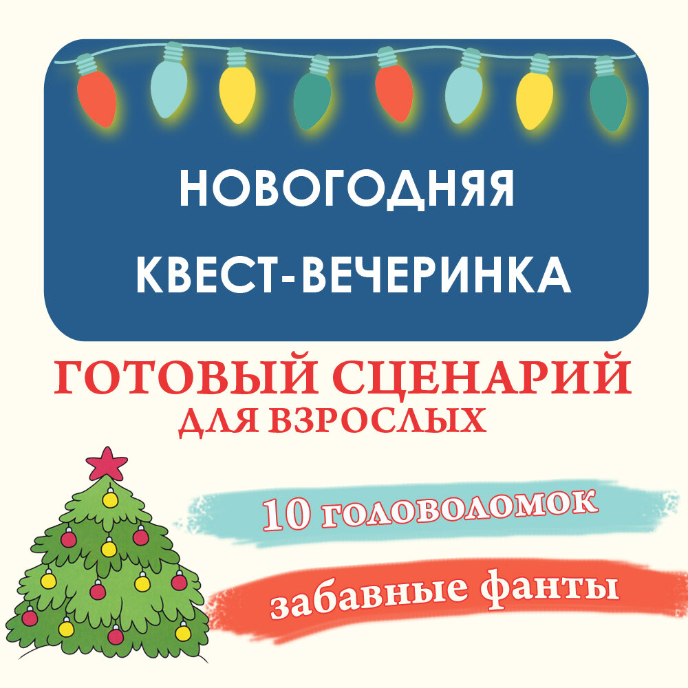 Набор заданий и дополнительных материалов для самостоятельной распечатки. Готовый сценарий квеста на Новый год с элементами вечеринки - это не только отличный способ устроить сюрприз гостям, но и возможность отлично повеселиться. И при этом вам не надо тратить время на подбор заданий - всё уже готово, вам останется только распечатать и спрятать карточки в тайники. В сценарии квеста для взрослых 10 карточек с заданиями в новогоднем оформлении, а также наборы забавных фантов (групповых и индивидуальных), которые надо будет выполнить гостям. В наборе также есть шаблон фантов и список смешных заданий, которые вы сможете на свой выбор вписать в шаблон. Стоимость сценария новогоднего квеста-вечеринки для взрослых: 300 рублей. Роль ведущего не потребует от вас организаторских способностей - вы только следите за игрой и раздаёте фанты (примерно как ведущий в "Мафии"). Ход игры: ведущий выдаёт первую карточку с заданием + фант (например, молчанка на весь тур). Нужно разгадать головоломку