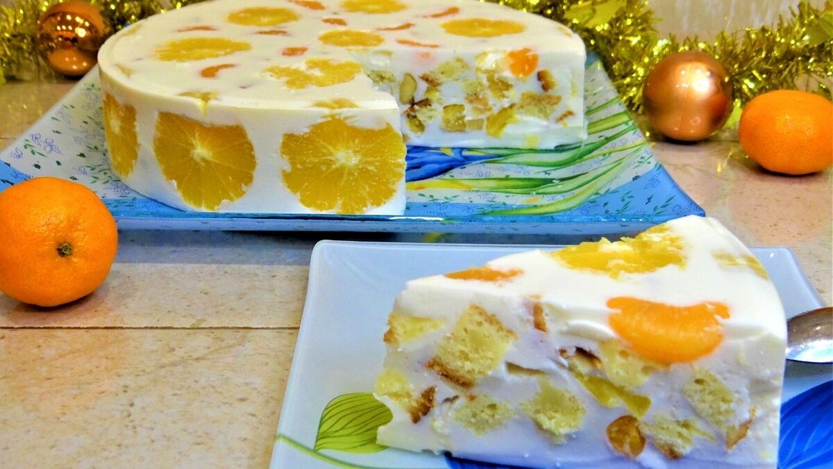 В форму с разъемными бортиками (26 см) по бокам и в середине выложить красивый рисунок из апельсинов и мандаринов.