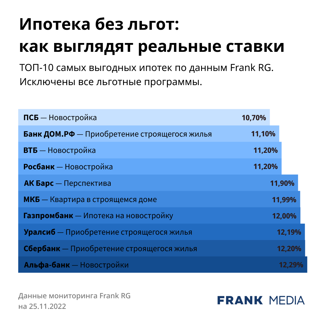 Frank RG обновил рейтинг самых выгодных ипотечных программ для новостроек без льгот. Готовы ли вы брать ипотеку по таким ставкам? Россияне привыкли к ипотечным льготам, которые стали доступны для всех покупателей новостроек. Однако Минфин уже предупредил, что самая масштабная из льготных программ — для первичного рынка под 7% — вскоре закончится. «Мы исходим из того, что программа будет закончена 31 декабря 2022 года», — рассказал замминистра финансов Алексей Моисеев в кулуарах Госдумы. Бюджету накладно субсидировать ставки, к тому же властям не нравится рост цен на жилье. Будут ли люди брать ипотеку по реальным ставкам? Пишите свое мнение в комментариях. Также Frank RG собрал актуальные изменения ставок по ипотеке у крупных игроков этого рынка (данные на 25 ноября 2022 года) Понравился рейтинг? Подпишись на нас ВКонтакте, чтобы быть в курсе последних новостей про деньги, банки и финансовые рынки