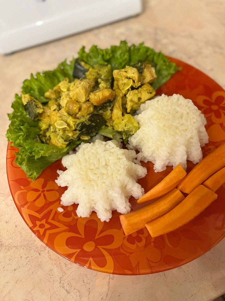 Ингредиенты: Приготовление: Лук нарезать средним кубиком и обжарить в сотейнике на растительном масле до размягчения. Кабачки и баклажаны помыть, нарезать кубиком и добавить к луку. Филе грудки промыть, нарезать кубиком и тушить вместе с овощами. Затем добавить в сотейник сметану, чеснок, натертый на терке, и специи по вкусу. Тушить на маленьком огне до готовности. Рис тщательно промыть холодной водой и сварить в подсоленной воде. Морковь вымыть, почистить и нарезать небольшими дольками. Подача: На лист салата выложить готовое рагу. Рис выложить в смазанную растительным маслом железную форму, перевернуть форму на тарелку для подачи и аккуратно снять формочку( по желанию). Морковные палочки выложить на тарелку. Вкусный ужин готов! Приятного аппетита!