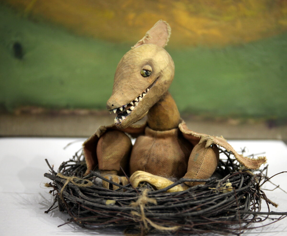 Знакомьтесь, птенец птеродактиля по имени Тарлтон. Очень оптимистичен и дружелюбен. Смешанная техника. Голова - можжевельник. Шея, лапы - береза. Глаза - поталь, шеллак. Тело, крылья - джинсовая ткань, крашеная вручную. Набит можжевеловой стружкой.