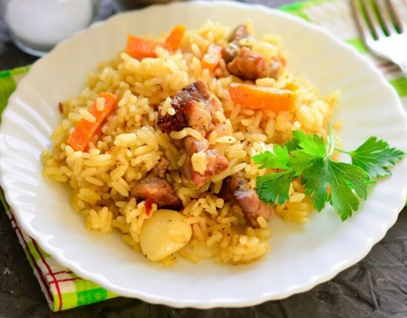 Вам понадобится: Куриные бедра 600-700 г Лук 1 шт Морковь 1 шт Чеснок 1-2 головки Приправа для плова Растительное масло 1 ст.л. Рис пропаренный (270-280 г) Вода 2 стакана (400 г) Соль, черный перец по вкусу Куриные бедра нарезать на порционные кусочки. Лук нарезать пером, морковь – достаточно крупной соломкой, порубить несколько зубчиков чеснока. Перемешать мясо с луком, морковью и чесноком. Посолить, поперчить, посыпать приправой. Рис хорошо промыть. Рис выкладываем в рукав. Добаляем к нему 1 ст.л. растительного масла, приправу для плова, целые зубчики чеснока, соль по вкусу. Все перемешать. Каждая рисинка будет покрыта тонким слоем растительного масла, таким образом рис получится рассыпчатым. По центру кладем одну головку чеснока, хорошо вымытую заранее. На рис выкладываем мясо с овощами, выливаем в рукав 2 стакана воды фиксируем второй край. Запекаем при температуре 200 градусов 35-45 минут. Плов будет готов ,когда рис впитает в себя всю воду. Приятного всем аппетита