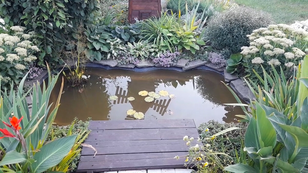 Пруд у нас из пластика, он небольшой. Объем его 1700 литров. Глубина в центральной части 60 см. В нем у нас живут караси и растет нимфея. Воду на зиму мы не сливаем. Все зимует в пруду как есть. Единственное что мы делаем, так это кидаем в пруд пластиковые бутылки с песком. Нас многие пугали, что такой пруд нужно сливать и убирать, что он не перезимует. Говорили что его разопрет или выдавит. Но ничего подобного, хорошо зимует, причем вместе с рыбами и нимфеей. Весной лед тает, вода прогревается и в пруду все просыпается.