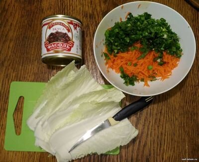 Зимой не хватает витаминчиков, поэтому так полезно иметь на обед или ужин салатик из свежих овощей. Не секрет, что сейчас томаты и огурцы в супермаркетах совсем не те, что летом. Покупаешь помидор за 100 рублей килограмм, а он - резиновый. Кладешь в холодильник огурчик до завтрашнего ужина, а он через день уже расползся в кашу, хотя цена у него была ого-го... Поэтому я давно отказалась от зимних томатов и огурцов, а перешла на использование морковки, капусты и яблок. Покупаю ещё зелень, но в салат кладу совсем немного, памятуя, что в зимней зелени нитратов куда больше, чем в летней. Лучше покупную зелень подержать около часа в миске с водой. Совсем неожиданно вместо яблок добавила в салат консервированную (без томатной пасты) красную фасоль, так собрался салат, который получил признание в нашей семье. Вот что потребуется: 5-6 листьев пекинской капусты по 3-4 веточки укропа и петрушки 2-3 побега зеленого лука, можно заменить горсткой красного ялтинского лука 1 морковка 1 банка красной