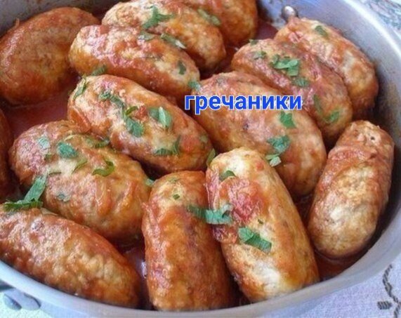 8Немного повторюсь... Ингредиенты: - 500 гр мяса (я использовала филе индейки) - 150 гр гречневой крупы - 2 яйца - 2 луковицы - 200 гр томатного соуса - соль, перец - по вкусу - мука для панировки - растительное масло для обжарки․ Приготовление: Гречневую крупу перебрать, вымыть․ Всыпать в кипящую подсоленную воду и отварить до готовности․ Остудить․ Мясо пропустить через мясорубку с одной луковицей․ Добавить в фарш яйца, соль и перец по вкусу, тщательно вымесить․ Соединить мясной фарш с гречкой, снова хорошо перемешать․ Из фарша сформовать котлеты, запанировать их в муке и обжарить полученные гречаники на растительном масле с двух сторон до золотистой корочки (как на фото)․ Вторую луковицу нарезать полукольцами и обжарить на растительном масле до золотистого цвета․ Влить томатный соус и прогреть․ Домашний томатный соус можно заменить покупным томатным соусом или томатной пастой, разведенной с водой в соотношении 1:1․ В сковороду с соусом выложить гречаники, накрыть крышкой и довести до