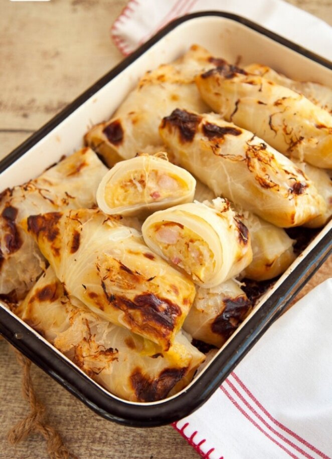 Ароматный картофель с жареным лучком, копченостями, вкусными шкварками, томленый в масле, да с ароматной, сочной квашеной капустой, в сочном капустном листике, запеченный в сметанном ароматном соусе - это повод полюбить голубцы. Или научится их готовить: это на редкость вкусно. Или сочетание вкусной картофельной начинки и капусты - или еще что, но что-то делает эти голубцы невероятно притягательными. Я не особый любитель голубцов, но эти хочется готовить часто, очень часто. Делюсь простым рецептом: так картофельные голубцы приготовить стоит. Готовим вкусные картофельные голубцы: рецепт + ингредиенты 1) Картофель отварить, размять в пюре. 2) Обжарить лук, добавить бекон, копченые колбаски. С удовольствием добавить все, что есть в холодильнике и подходит к картофельной начинке: от ветчины, охотничьих колбасок ..до шкварок :) Обжарить все с черным перчиком, можно и с лавровым листиком. Соединить с картофелем. 3) Бланшировать капусту. Можно это сделать проще, чем всегда: в кипяток опустит