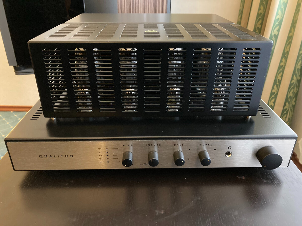 В 80-е годы иметь в студии активные мониторы BEAG было очень даже престижно, особенно если это BEAG HEC90 Studio Monitor. За ними и сейчас охотятся те, кто знает, что это за штучки:). Правда, найти в настоящее время изделия BEAG в хорошем техническом и косметическом состоянии очень тяжело. В начале 90-х годов BEAG перестал существовать, но недавно инженеры компании снова заявили о себе, теперь под брендом "Qualiton", и на рынке уже появились новые модели аудиотехники. Познакомиться поближе удалось с их полным ламповым усилителем Qualiton X200. Стоит он около 5000 Евро, что для усилителя такого высокого уровня звучания является относительно небольшой суммой. Технические параметры, заявленные производителем: 1. Предварительный усилитель 2. Усилитель для головных телефонов 2. Усилитель мощности Послушал его с двумя парами совершенно разной акустики - с высокочувствительными большими напольными Audio Solutions "Figaro L"(Литва) и с небольшими полочными Block Audio (Чехия). На фото ниже Qua