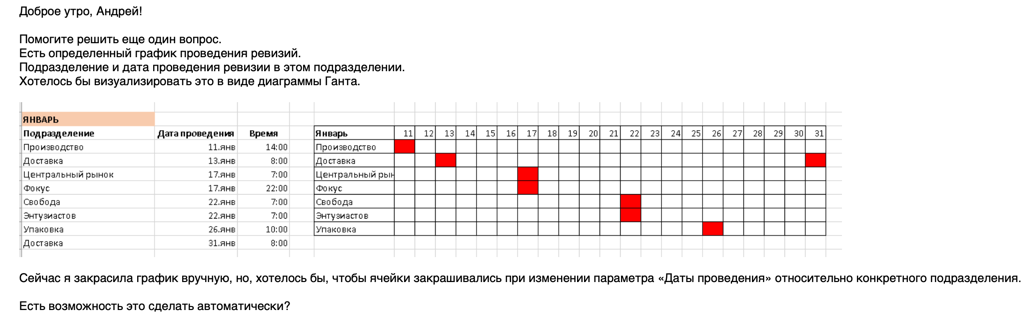 В этой статье отвечу на вопрос, полученный по электронной почте: Есть график проведения ревизий в разных подразделениях предприятия. Этот график создается вручную в отдельной таблице и необходимо эти данные визуализировать. Фактически это не совсем диаграмма Ганта. Мы здесь не отмечаем начало и конец определенного этапа в составе общего проекта, а лишь фиксируем дату ревизии конкретного подразделения, поэтому автоматизировать создание такого графика довольно просто и поможет в этом условное форматирование. Итак, изначально у меня есть таблица с датой и временем проведения ревизии. По сути первый столбец с заголовками графика полностью повторяет первый столбец исходной таблицы. Поэтому я создам аналогичный столбец сославшись на соответствующие ячейки исходной таблицы и протянув формулу по соответсвующему диапазону столбца Е. Ну а первая строка графика - это календарь. При этом, чтобы мы могли воспользоваться условным форматированием, важно, чтобы числа в первой строке графика были зад