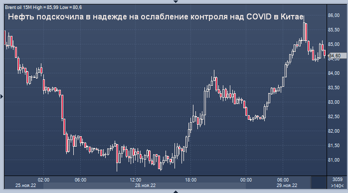 Китай проведет пресс-брифинг по борьбе с COVID. Инвесторы ожидают следующего заседания ОПЕК+ по добыче 4 декабря. ЕС не может договориться о предельных ценах на российскую нефть, заявляют дипломаты График нефти марки Brent интервалами в 15 минут Нефть подскочила во вторник на фоне надежд на то, что Китай ослабит контроль над COVID-19 после редких протестов против стратегии страны по борьбе с COVID в минувшие выходные в крупных китайских городах. Фьючерсы на нефть марки Brent выросли на 1,4 доллара, или на 1,7%, и торговались на уровне 84,57 доллара за баррель в 06:45 по Гринвичу. Фьючерсы на американскую нефть марки West Texas Intermediate (WTI) выросли на 1,17 доллара, или на 1,5%, до 78,39 доллара за баррель. Ранее сегодня оба бенчмарка поднимались более чем на 2 доллара. Китай проведет пресс-конференцию по профилактике COVID и мерам контроля в 3 часа дня (07:00 по Гринвичу) во вторник на фоне рекордных случаев заражения COVID и протестов в Шанхае и Пекине. подробнее Азиатские акции