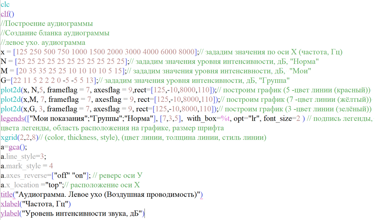 Вариант построения результатов определение слуховой чувствительности к звуковым волнам различной частоты в Scilab. Бланк аудиограммы