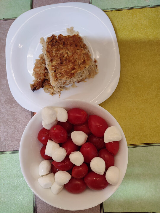 На завтрак приготовила запеканку из кабачков и капусты с добавлением муки спельты. 2-3 небольших кабачка натереть на терке. 2 большие луковицы нарезать или тоже натереть. Маленький кочан цветной капусты – тоже. Все перемешать, добавить 200 мл сметаны 10% (можно жирнее, а можно греческого йогурта - не важно). Можно сыра натереть туда же. Полстакана рафинированного масла, 1 пакетик разрыхлителя, 4 ст. ложки муки. Можно не муку, а крупную овсянку. 4 яйца, соль, можно любую зелень. Все перемешать - получается немало - и выложить в форму. Я беру одноразовую алюминиевую и застилаю пекарской бумагой. Выпекаю на 180-190 градусов часа полтора, чтобы хорошо зарумянилась, иногда немного дольше. Можно чеснока добавить - это по желанию. А к запеканке помидорки черри и шарики Моцареллы. Больше общения и рецептов - в группе "Рецепты для диабетиков" в ВКонтакте! Рецепт на странице Автор рецепта – Elena Neoupokoeva